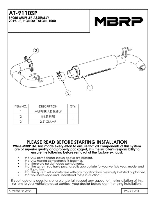 MBRP Slip-on system w/Performance Muffler Honda Talon 1000 2019-2025