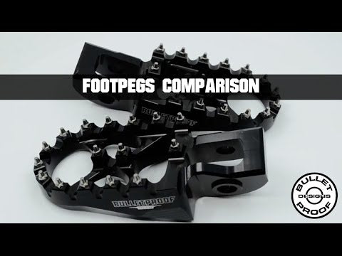 The Bullet Proof Designs footpegs are machined out of Billet 7075 Aluminum are a great upgrade from the stock footpegs that come with your bike at purchase. Wider than stock, sharp stainless steel pins, and wide grooves allow minimal mud buildup, excellent boot grip and a clean great looking design.