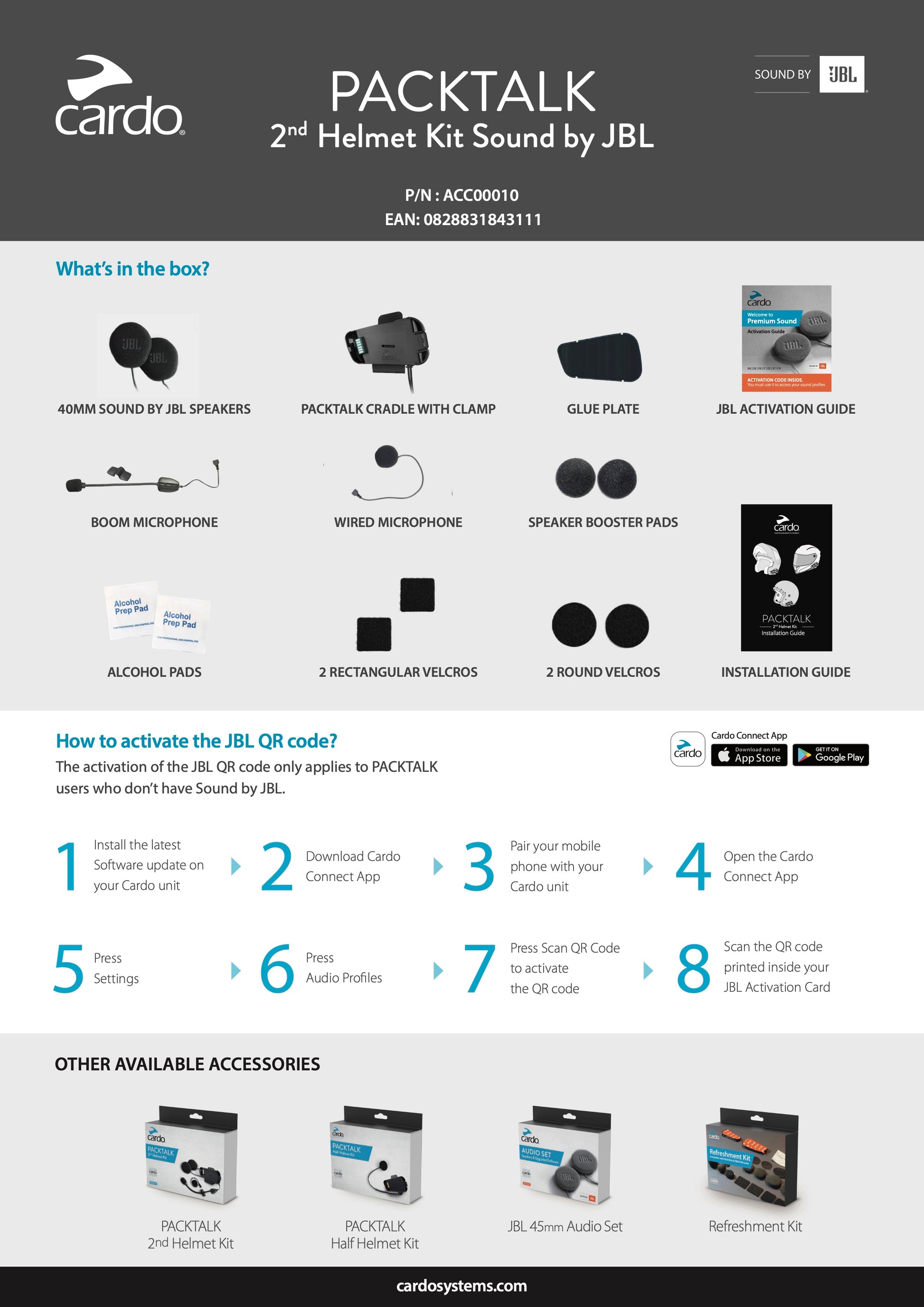 Easily switch between helmets with the Cardo Packtalk 2nd Helmet JBL Kit, featuring 40mm JBL speakers and interchangeable mics.