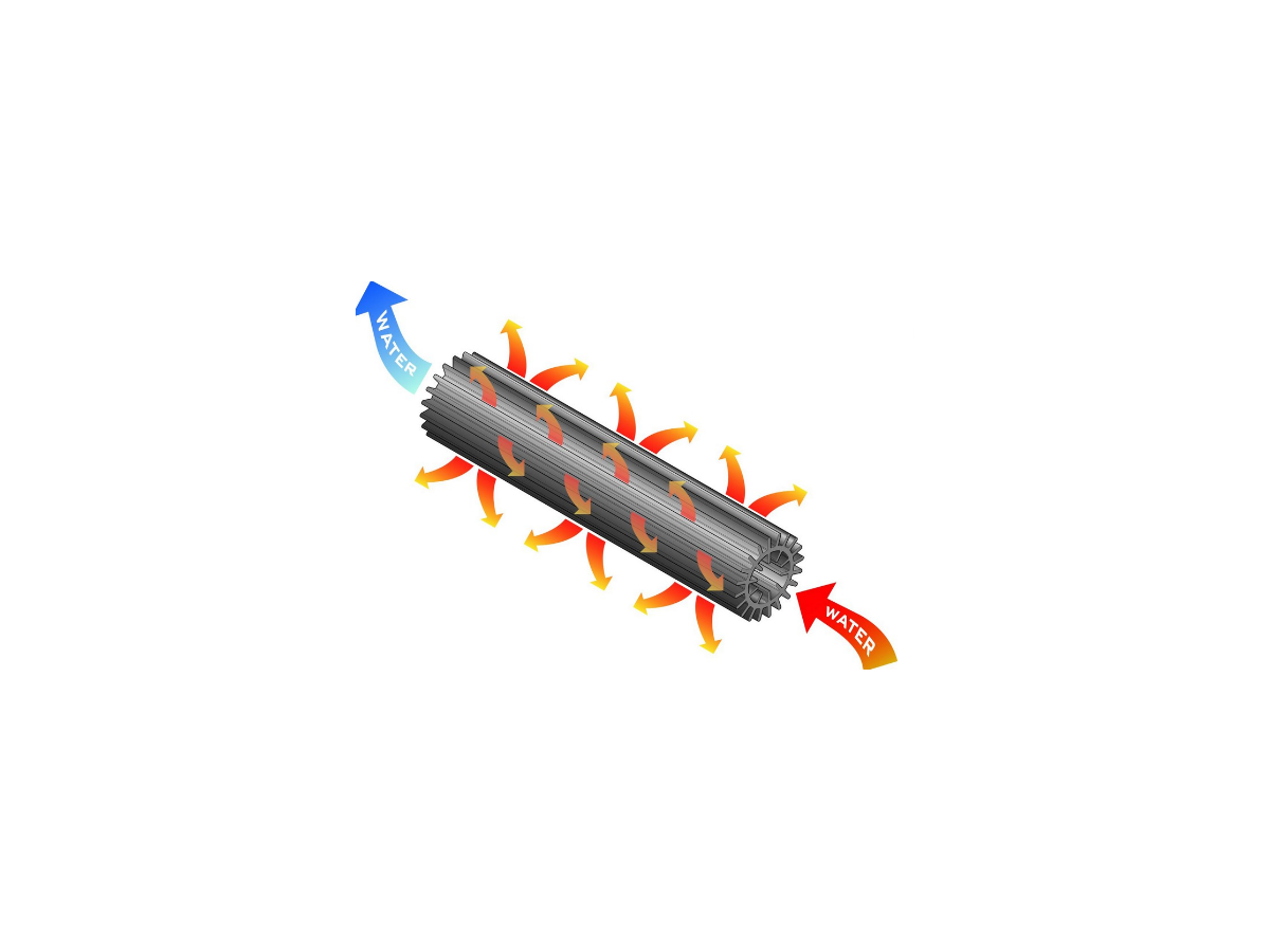 The "heart" of the project can be found in one component: a peculiar custom made extruded tube which allows to transfer and dissipate heat to the outside through its winglets. These winglets can be found both in the inside and outside of the tube.