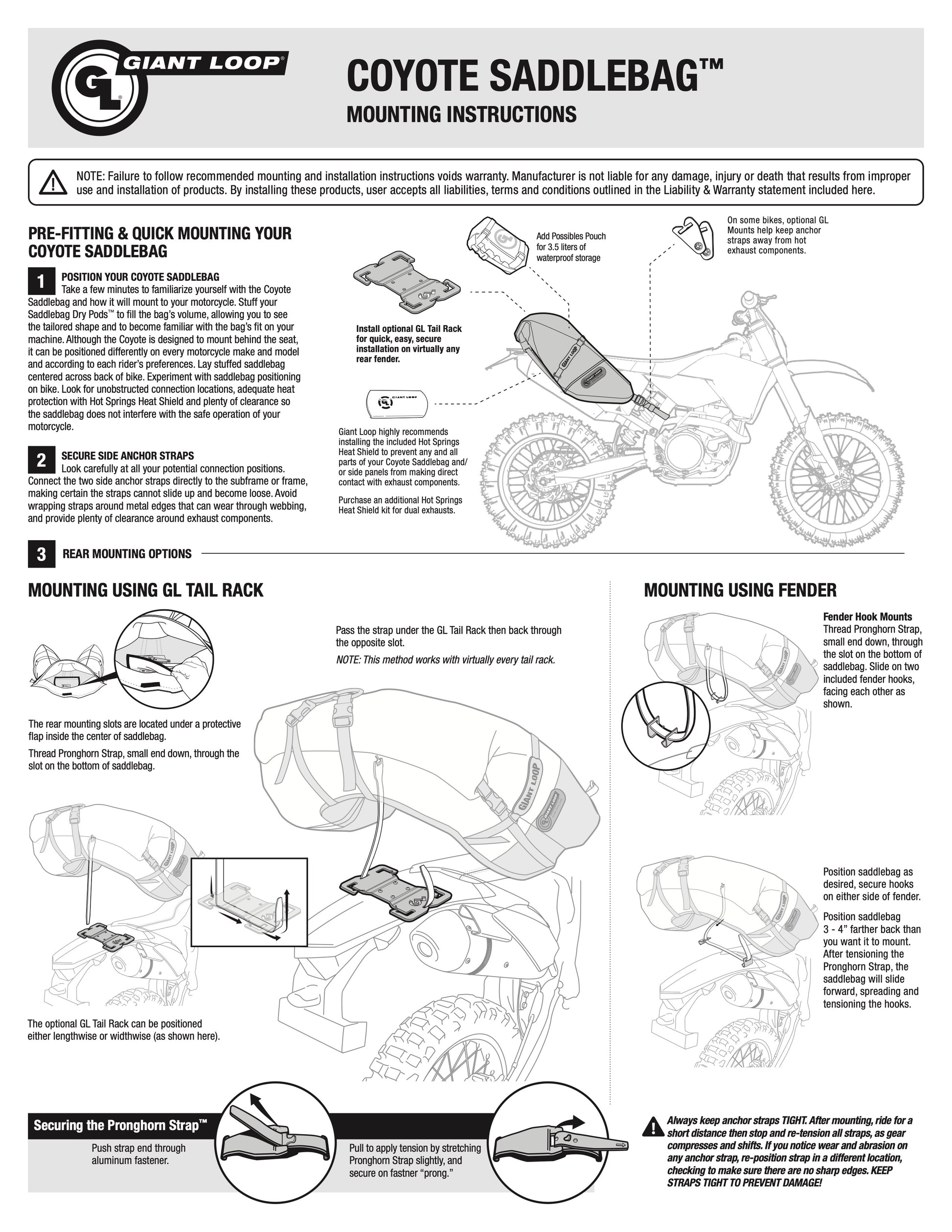 The Coyote Saddlebag is Giant Loop’s original rackless design for packing up to 39 liters of gear on multi-day rides. Built with highly resistant Bomb Shell™ materials, it’s a must have for transporting gear through even the toughest terrain. The Coyote can be mounted to the rear fender or tail rack of virtually any dirt bike, dual-sport, or enduro motorcycle. Includes waterproof inner liner Saddlebag Dry Pods™ and 25-inch Pronghorn Strap™ for complete waterproofing and easy installation.