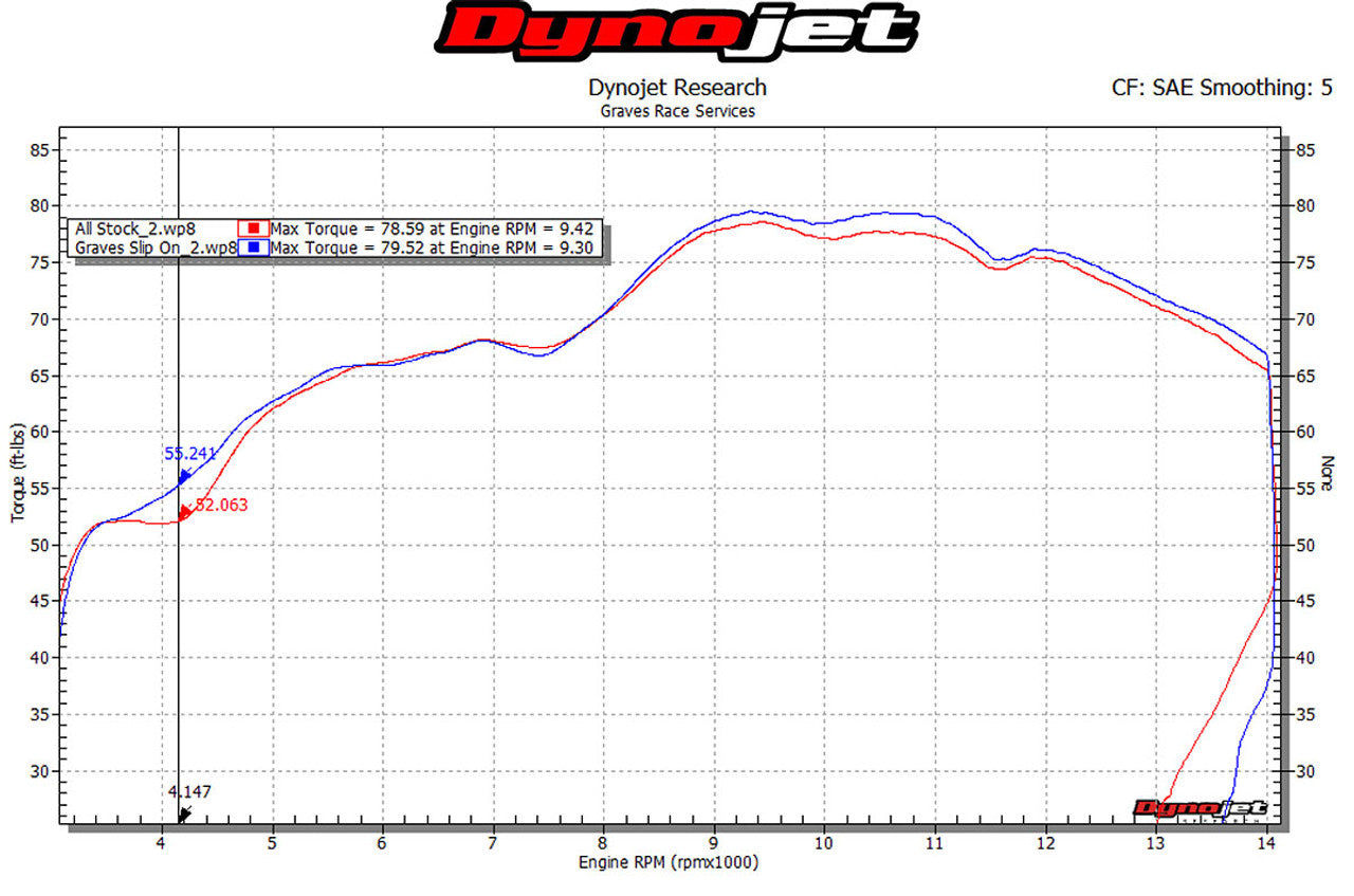 - Graves Slip-on Carbon = 3.5 lbs. / Stock Muffler = 8.8 lbs.