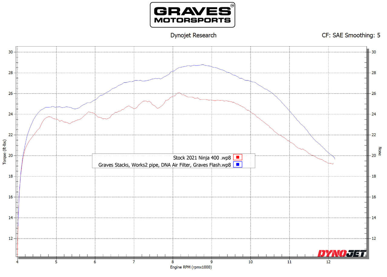- 1st & 2nd Charts show a completely stock bike compared to a bike equipped with the Graves' velocity stacks, WORKS2 full exhaust, DNA air filter and Graves FTEcu flash