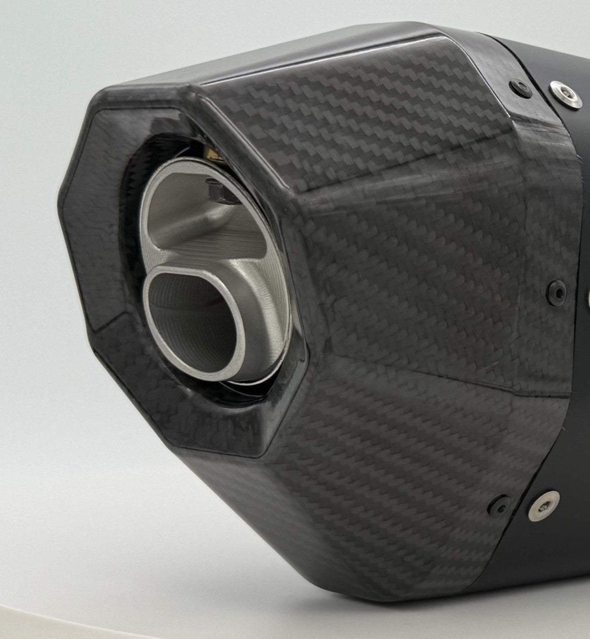 - New Octagon Silencer Design Featuring: Aluminum silencer body with Stainless end caps and a Carbon Fiber beauty cover. The new silencer has greater volume for reduced sound, long life and a deep throaty exhaust note
