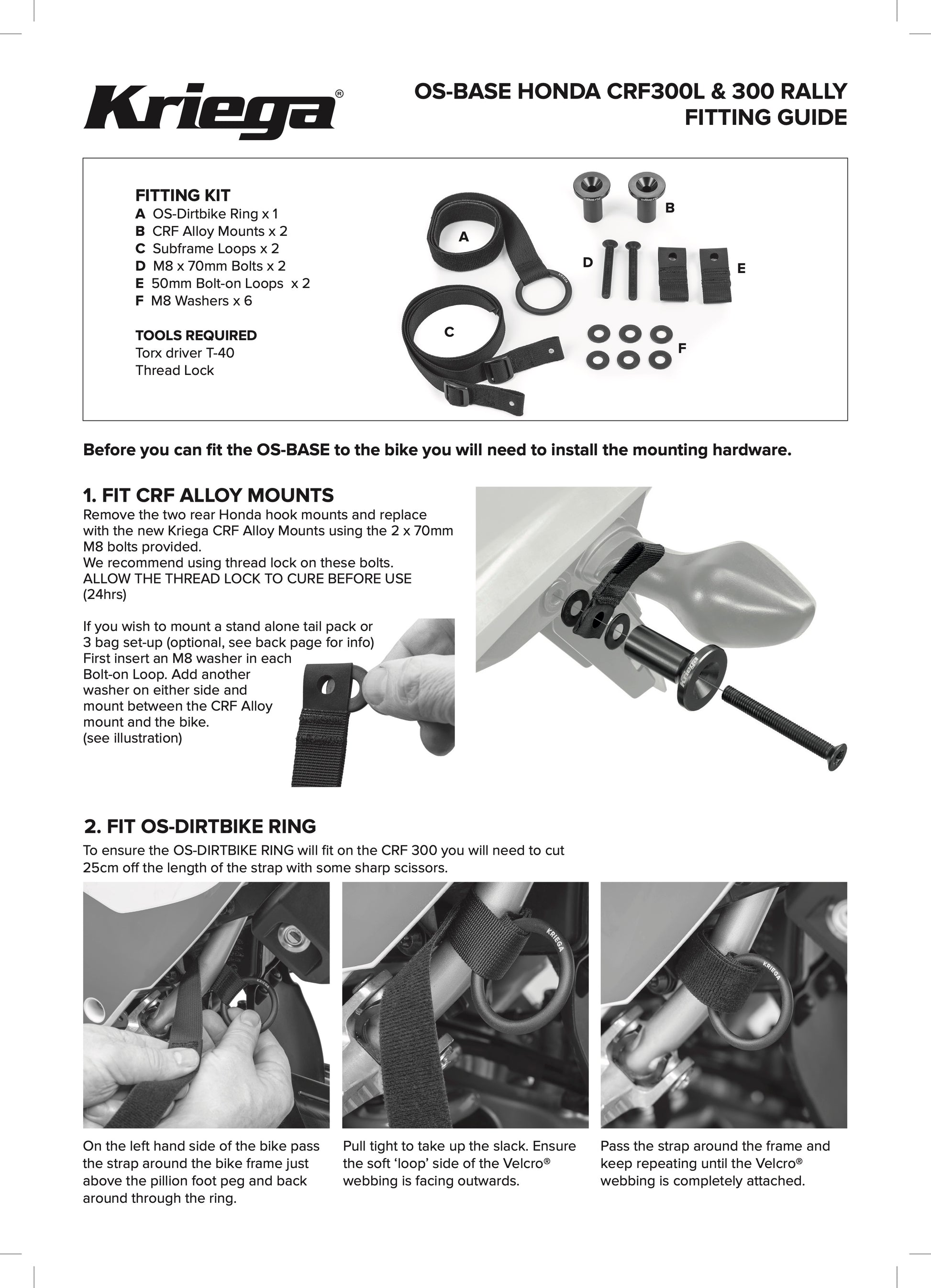 The OS-Base CRF300 is an over-the-seat harness designed for mounting OS-6, OS-12, or OS-18 Adventure Packs as soft panniers on your Honda CRF300L or CRF300 Rally. This lightweight, durable system requires no metal frames, drilling, or permanent modifications. The included hardware offers flexibility to configure one, two, or three packs based on your needs, and the set-length straps make installation a breeze. With a custom shape for a secure fit and ample clearance from the exhaust, the OS-Base can be mounted in under a minute and removed just as quickly.