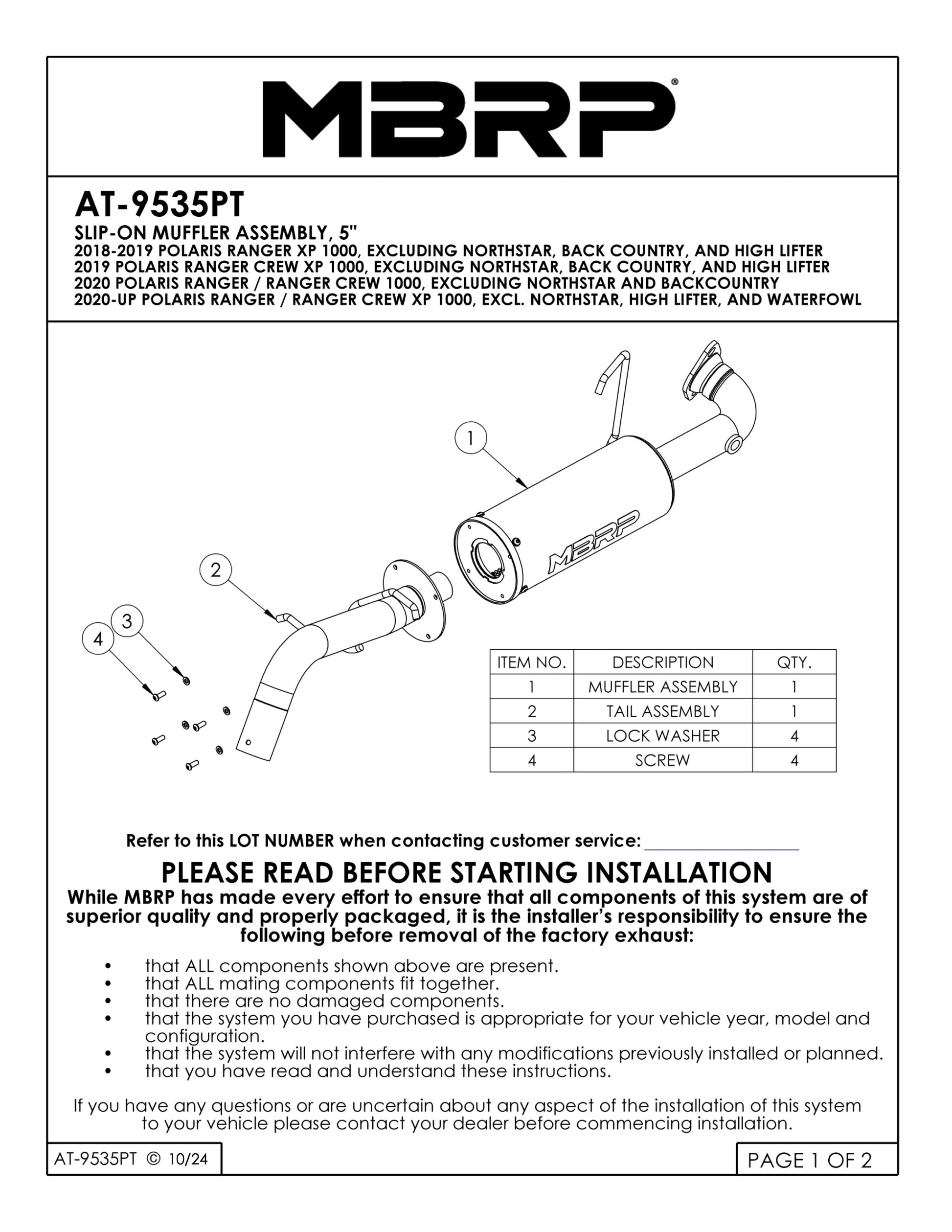 Upgrade your 2020-2026 Polaris Ranger/Ranger Crew XP 1000 | 2020-2020 Polaris Ranger/Ranger Crew 1000 | 2019-2019 Polaris Ranger Crew XP 1000 | 2018-2019 Polaris Ranger XP 1000 with the MBRP® Performance Series, Chambered Core, Slip-on Exhaust. 1-Year Warranty included.