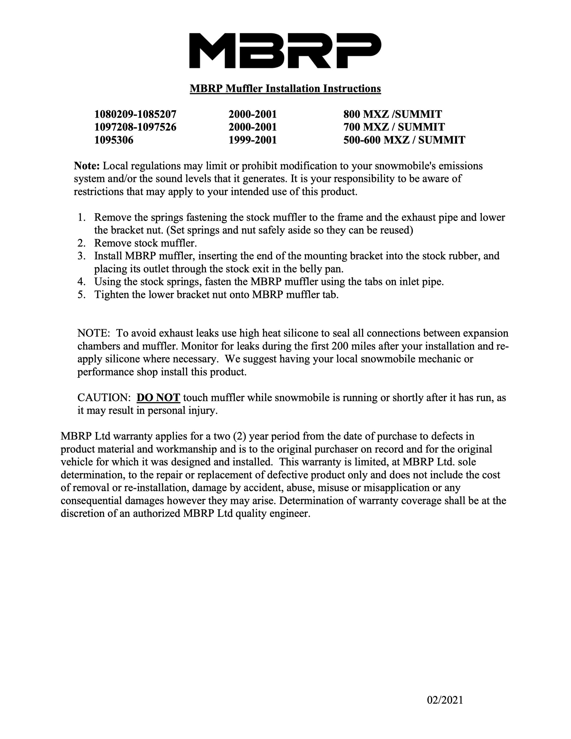 MBRP Race Exhaust Ski-Doo REV XP/ XM/ MXZ/ Renegade/ Summit/ GSX-800R/ 600/ 500TNT/ 500SS-Carb Models-Standard 2008-2020