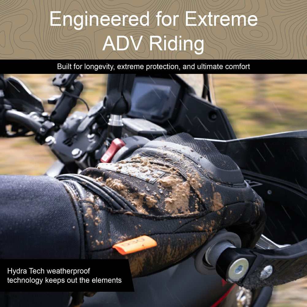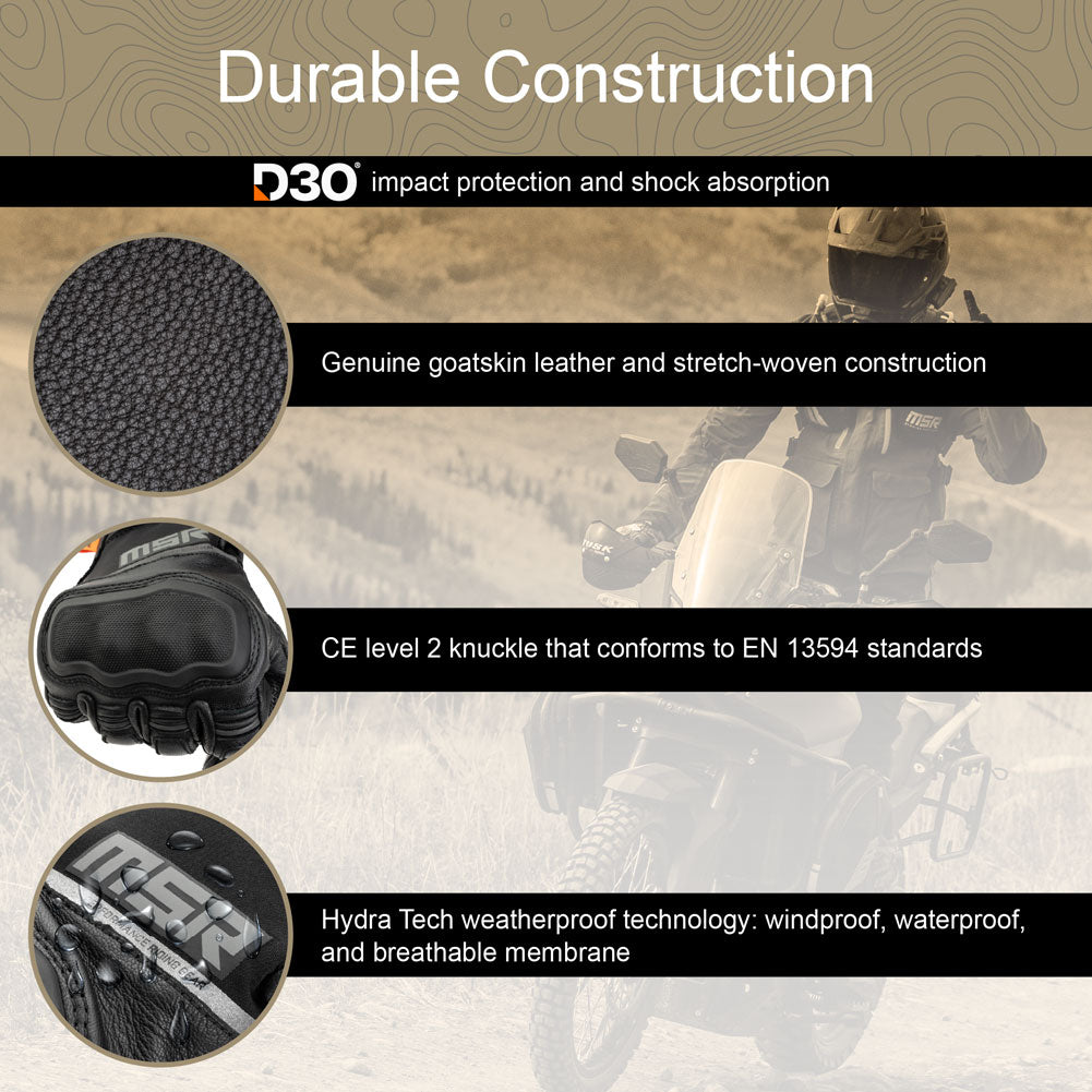 The MSR Gravex glove is engineered for longevity, extreme protection, and ultimate comfort. This non-insulated, waterproof leather glove built for most riding conditions. Hydra Tech weatherproof technology keeps out the elements while D3O armor and a CE certified knuckle protector ensure confidence at highway speeds.