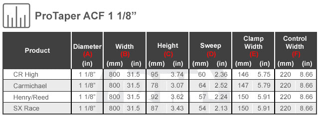 The ProTaper® ACF Handlebar uses a revolutionary unidirectional carbon fiber core system to become the first carbon fiber reinforced motocross handlebar. The added strength allows the aluminum tubing wall thickness to be safely reduced in key areas, greatly decreasing weight and producing unrivaled impact-absorbtion. Innovative Control+ design features 220mm of control space or up to 40mm more than conventional 1-1/8" handlebars.