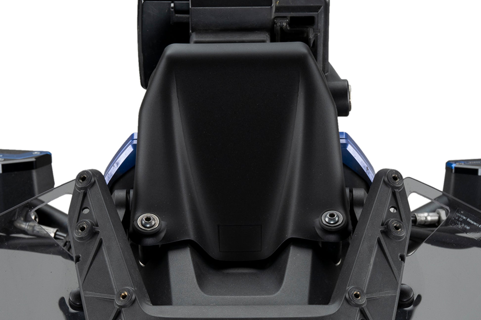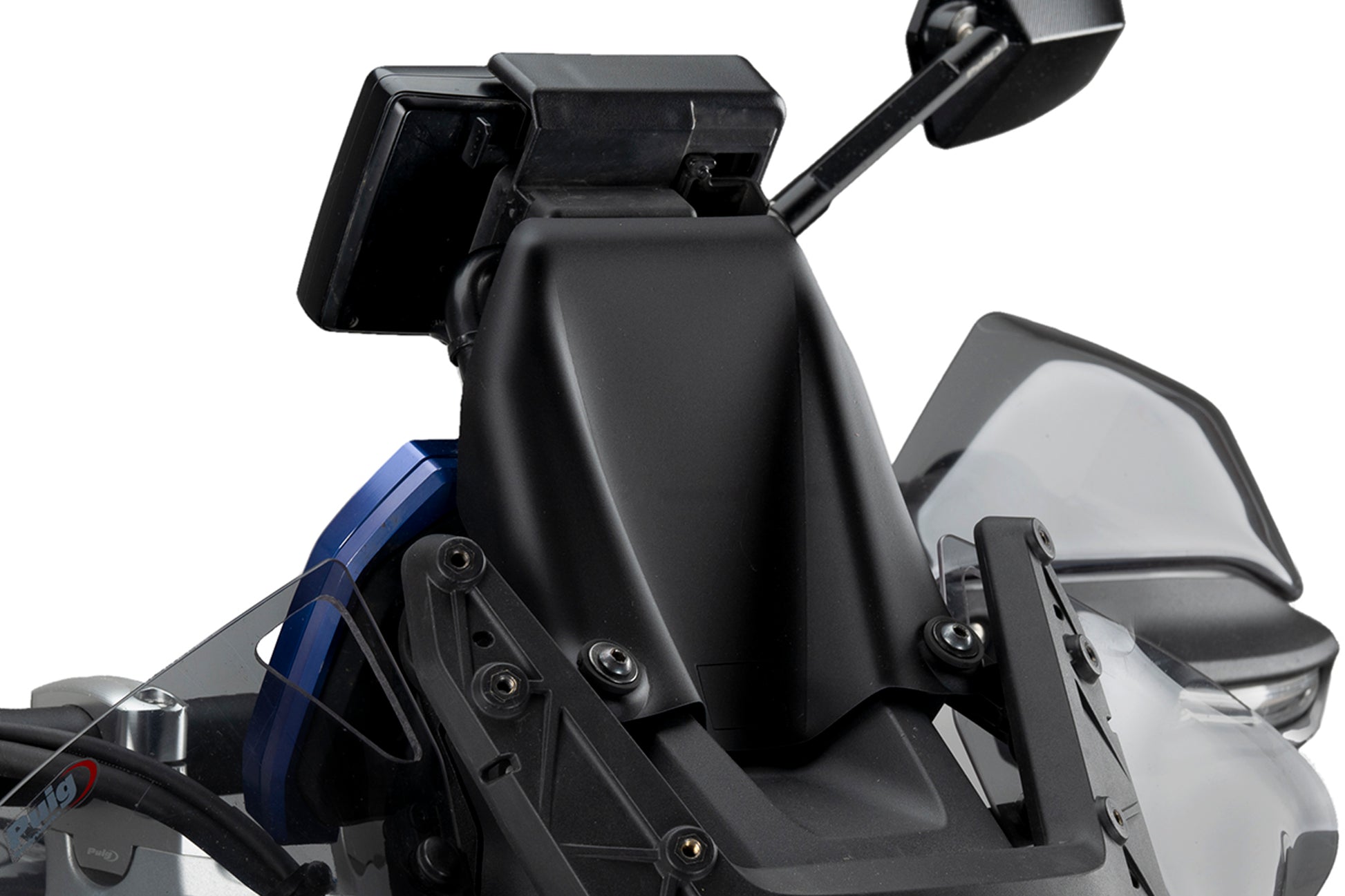 The GPS cover for the new BMW R1300GS and R1300GS Adventure is a solution developed by Puig in response to an issue identified on these models: when the windscreen is raised on rainy days, it creates a channel that directs water straight to the GPS area, potentially causing connection problems and safety risks while riding.