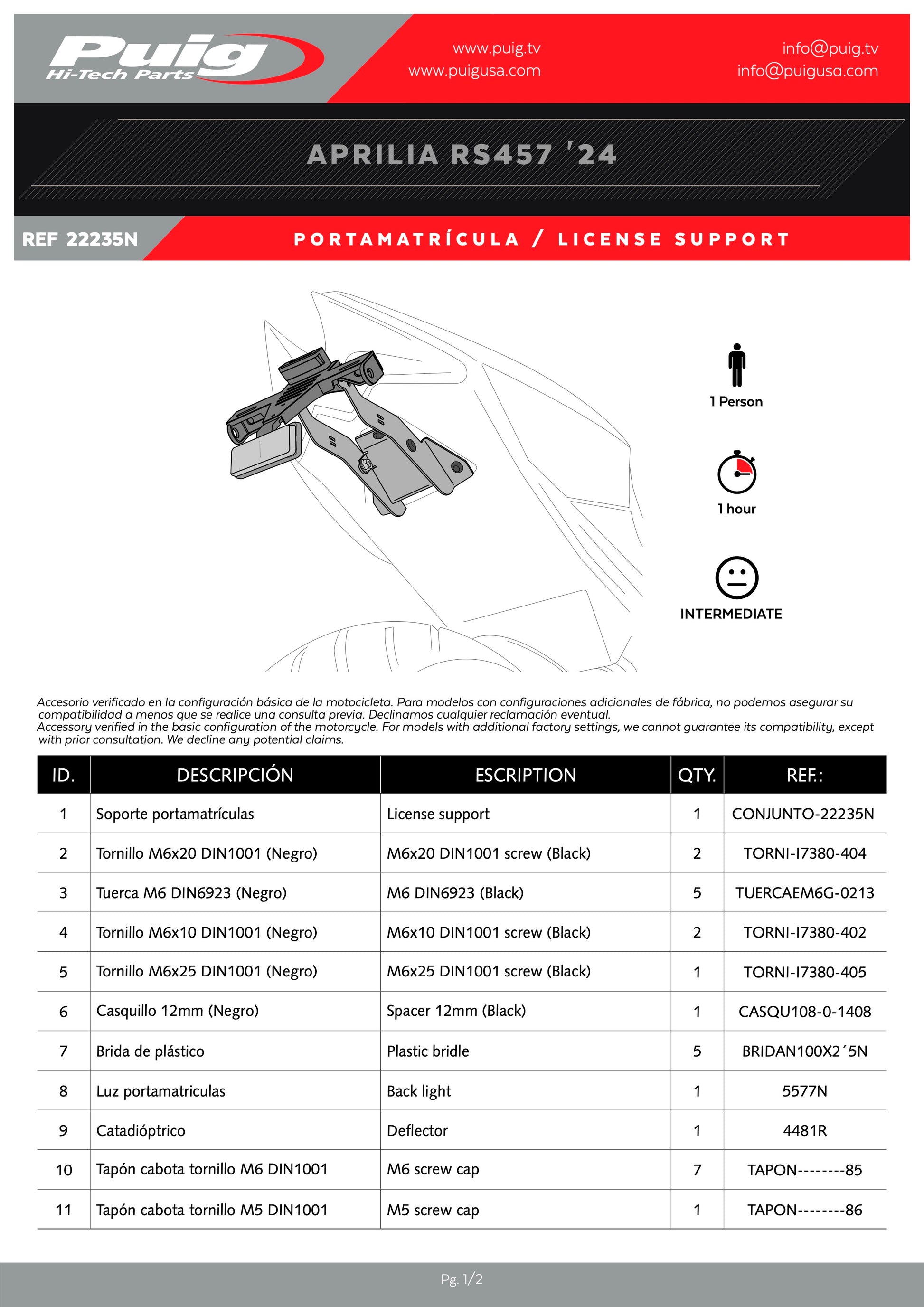 Puig License Plate Holders APRILIA RS 457 2024-2025