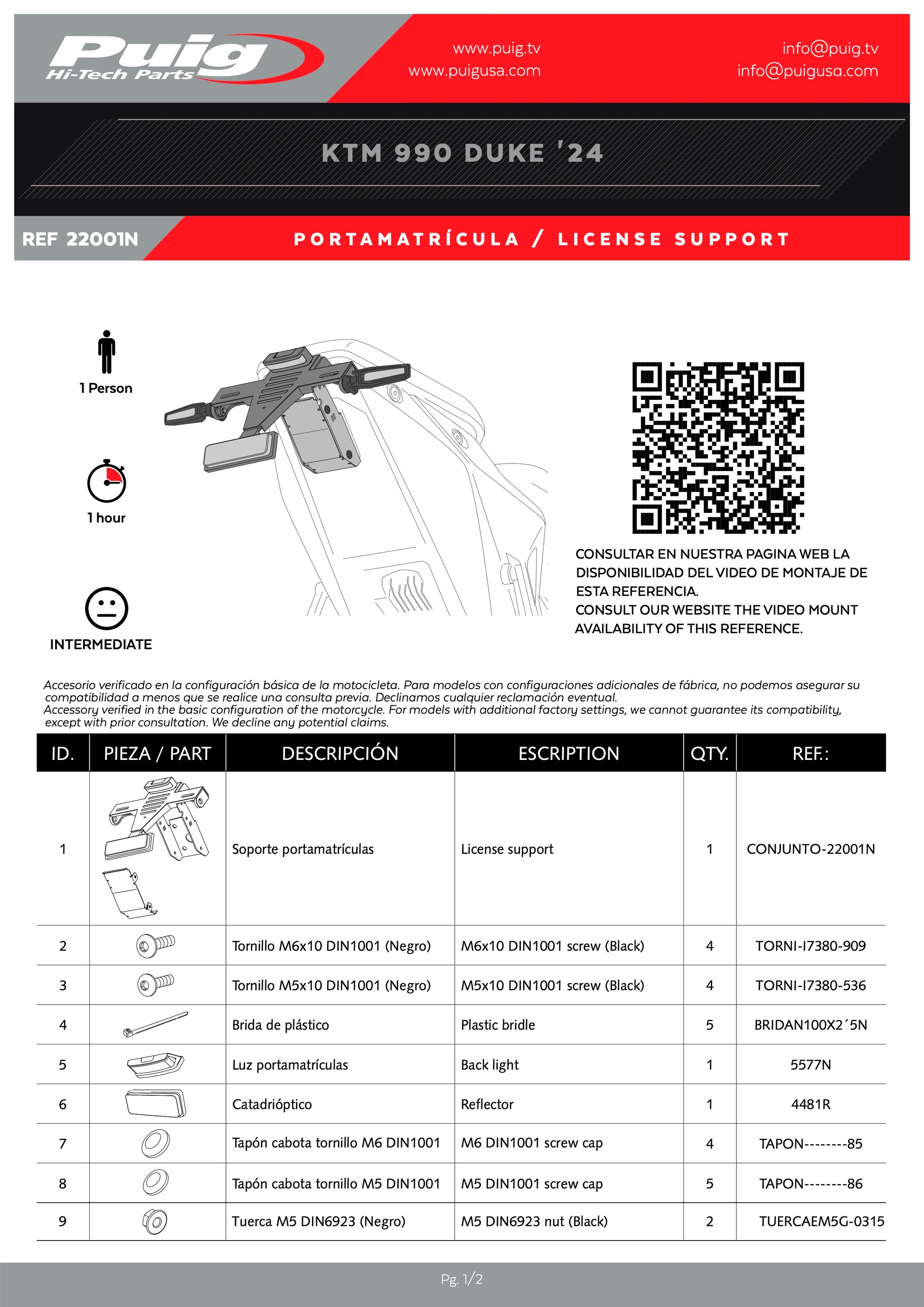 Puig License Plate Holder Fender Eliminator KTM 990 DUKE 2024-2025