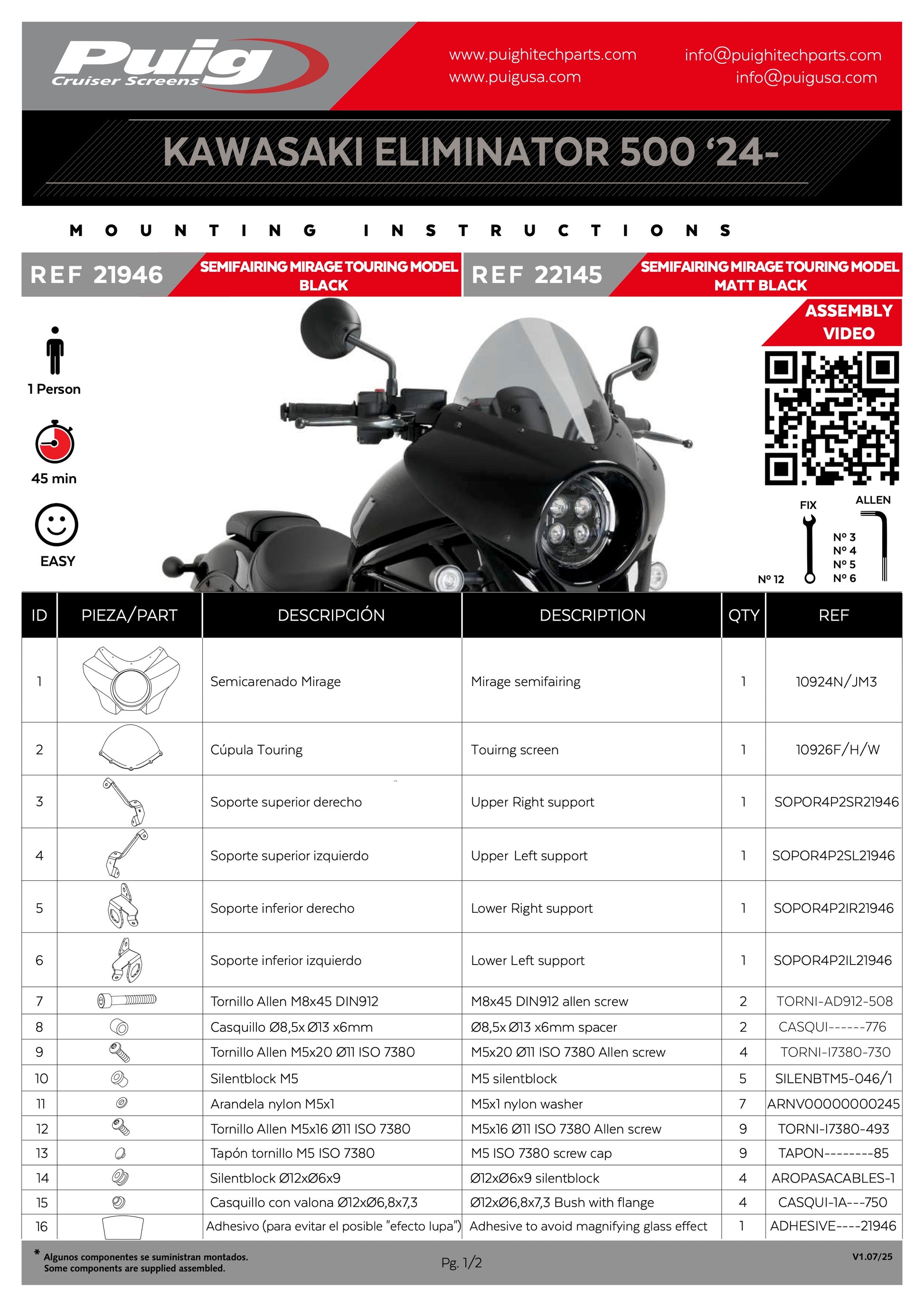 It allows installing two different screens, the Sport, more aggressive and minimalist, and the Touring screen that provides more aerodynamic protection. The screens are available in clear, light smoke and dark smoke to match the Mirage semi-fairing which is available in a matte black or gloss black finish.