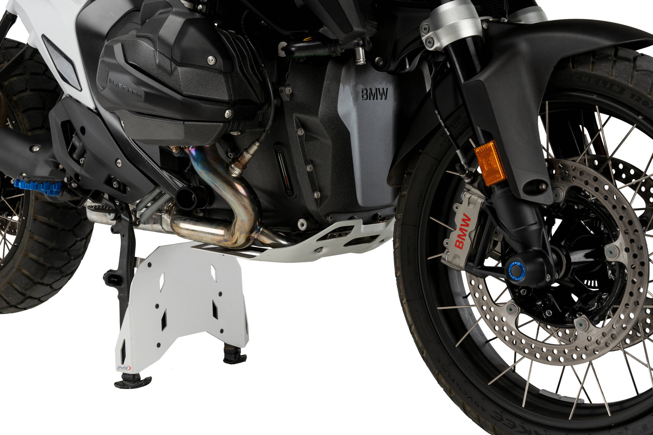 Increase the protection of the lower area of the BMW R1300GS, including the engine casing, exhaust headers, catalytic converter, and central stand with Puig's engine protector extension.