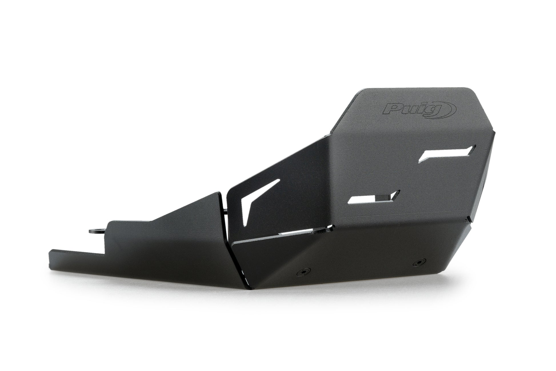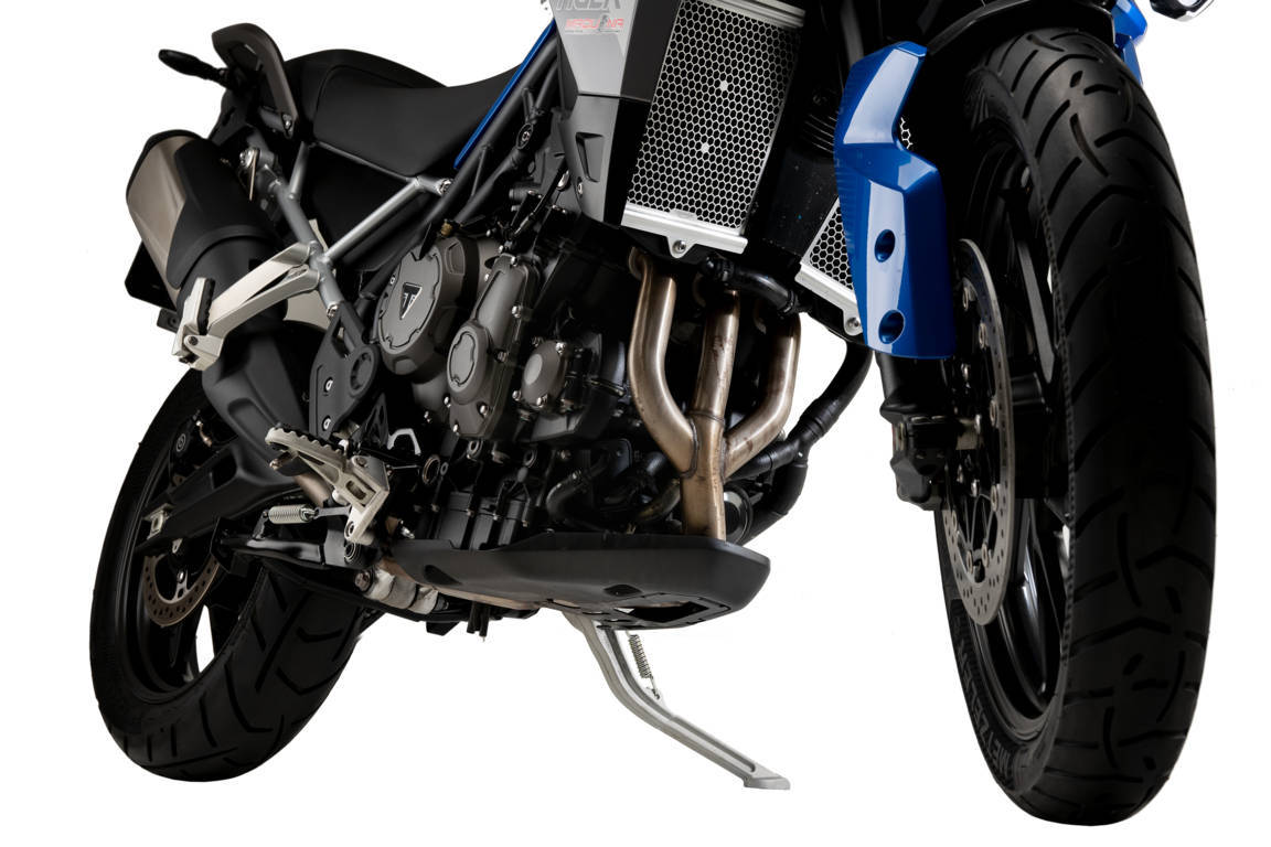 Puig's protective plate is longer than the OEM accessory mounted on the English trail, extending coverage to the catalytic converter area. Sturdy yet lightweight due to the quality of its materials, Puig's oil-carter protector features a simple and aggressive design that adds a more personalized and adventurous look to the Tiger 900.
