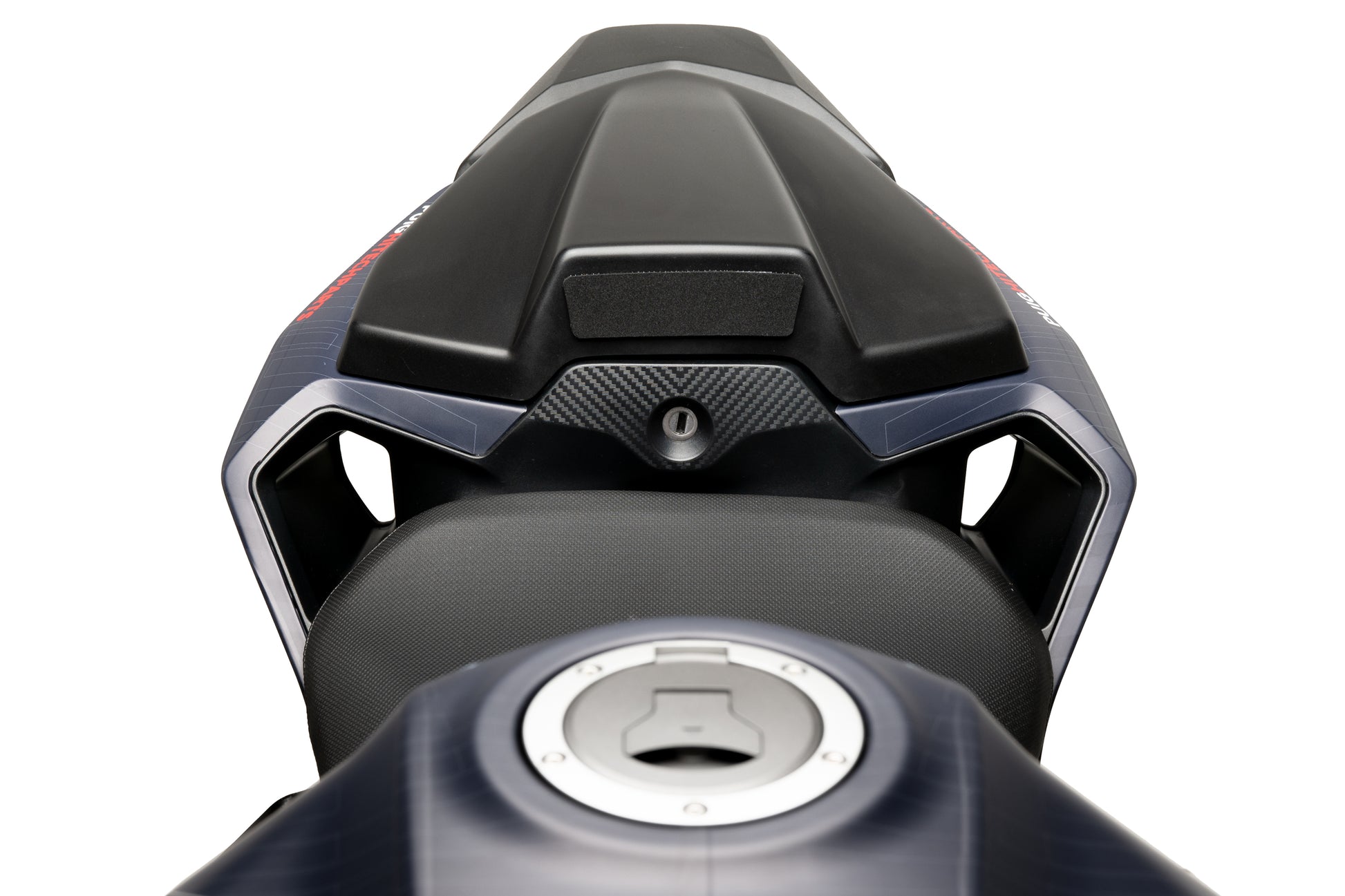 Its carefully studied design aims to lighten the rear, simplifying the bike's lines. Additionally, we incorporate a 4mm thick black neoprene foam in the front area of the tailpiece to enhance rider comfort when crouched at high speeds. Designed and manufactured near the Circuit de Catalunya in Montmeló, Barcelona, this piece is made from matte black ABS plastic, glossy black, or a durable and lightweight 3mm thick carbon-like material.