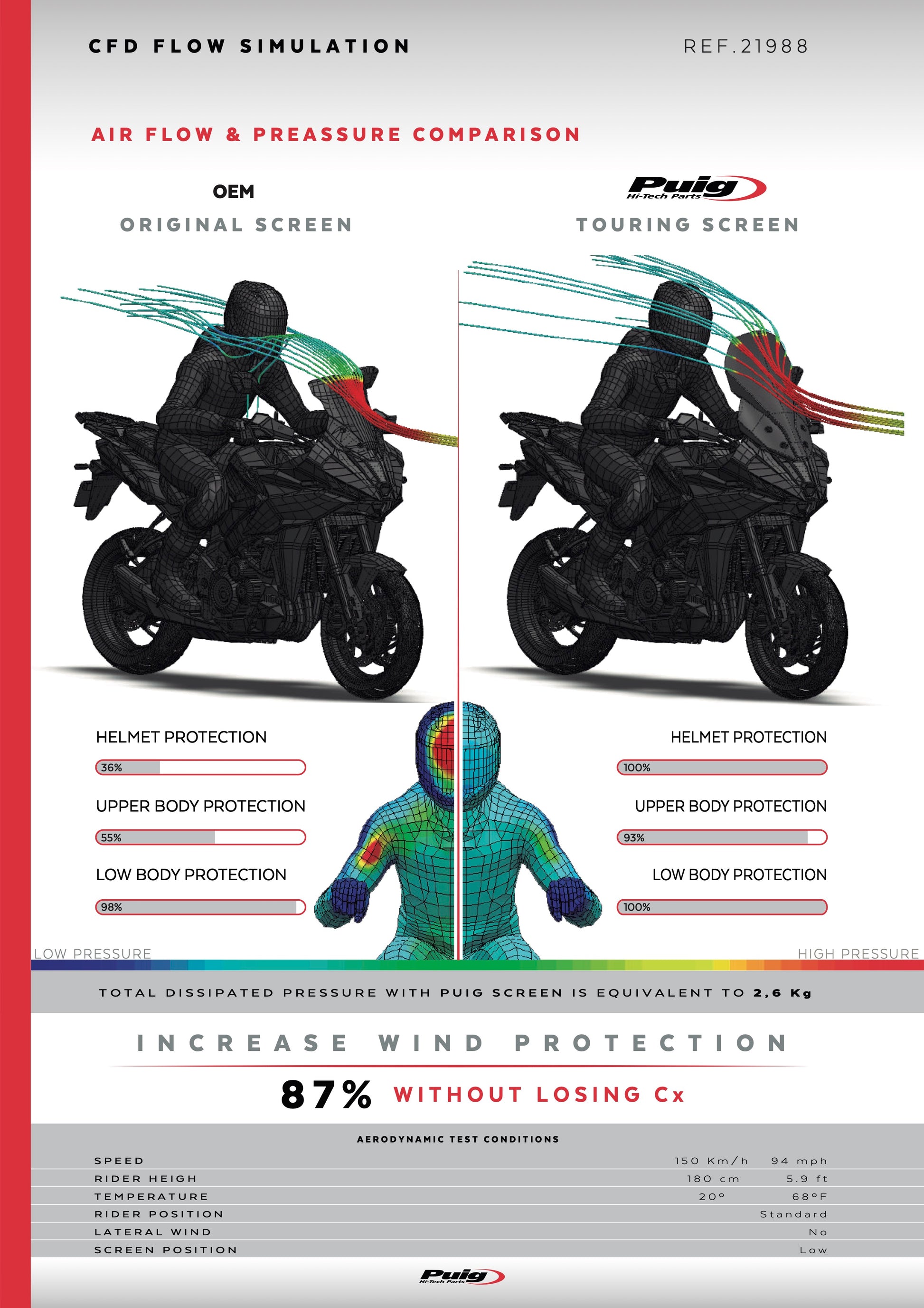 The assembly of this screen follows a process that can be done without having to ask for a mechanic thanks to its simple and intuitive adaptation. The package also includes the aerodynamic studies that have emerged from comparing the Puig screen with the original in a virtual wind tunnel.