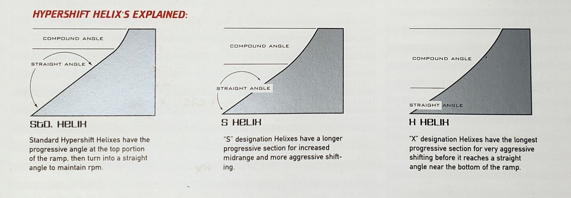 Just like the good ole days! We are reintroducing these billet aluminum helixes cut to the old Hot Seat Performance specs. Hot Seat helixes are available in many angles to suit any application. The Hypershift helix gives a strong holeshot and aggressive upshift with a lightning quick backshift. All Hot Seat helixes are adjustable up to 8 degrees by adding or subtracting shims behind the snap ring. A hard teflon coating will never wear off and offers a very quick upshift and backshift. Compound Radius helixes are progressive on the first section of the ramp and have a straight angle on the end of the ramp. Helixes with an "S" and "X" designation have more midrange angle, the progression from the compound angle to a straight angle is farther down the ramp- see pic for illustration. Progressive helixes progressively change from the starting angle to the ending angle down the whole ramp. 100% Made in the USA.