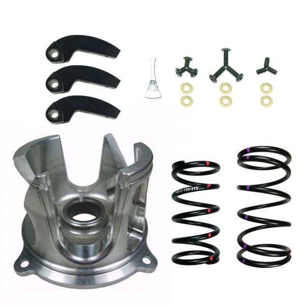 The individual components will vary depending on the application and riding elevation, but most of our performance clutch kits come with an H5 Alloy Primary Spring, a set of our Hypershift machined weights, one of our custom cut Secondary Helixes, and an H5 Alloy Secondary Spring. Some kits may also include a tip weight adjustment kit for fine tuning or a new drive belt as well. If you want a smooth, yet hard pulling holeshot, excellent back shifting and great throttle response, look no further than the Speedwerx Hypershift Clutch Kits.