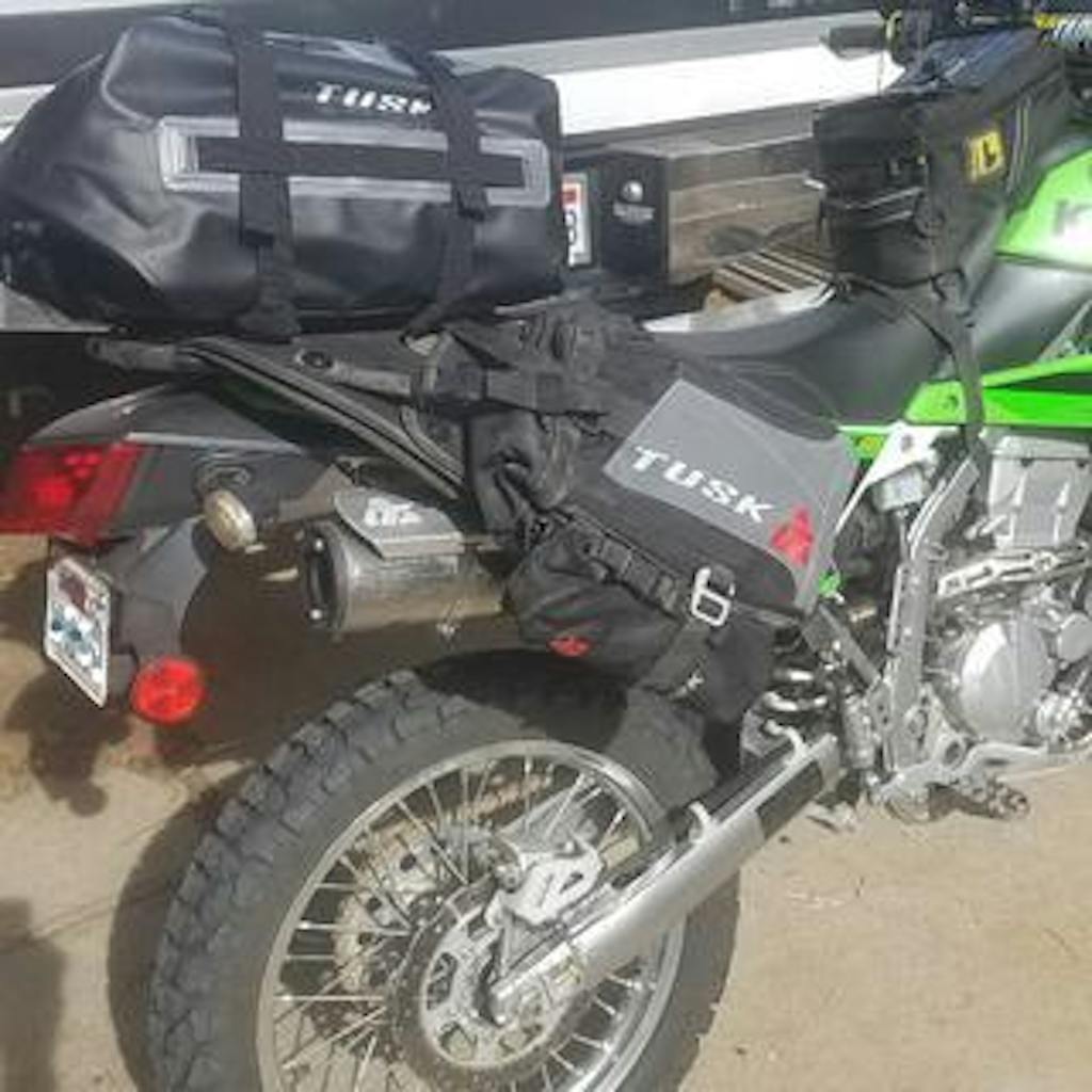 As convenient as the top bag is, if you are going to do any sort of downhill, need to get over the back of the bike for any reason, or plan to ride even slightly aggressively, it is completely in the way. It made some fairly basic descents and obstacles very sketchy because you cant get far enough back over the bike so it feels like you are going over the bars. Just something to be aware of and not a criticism of the product, it is what it is. We didnt think it would be a big deal until we got into these situations. The top bag is great if you are just going to cruise on the dirt roads like most people would with a big ADV bike. We rode some fairly gnarly terrain on our trip, and if I were to do this trip again Id probably take a bit less stuff, leave the top bag at home, and carry a slightly larger backpack to compensate for the lost space. One of our guys strapped a pad to his handlebars and that worked great (see photos). It worked out so well I am looking for a dry bag shaped like his pad to attach to the handle bars to get some of the lost storage space. Just have to figure out a better way to deal with the front brake line. Tusk, if you decide to make one that would be much appreciated.