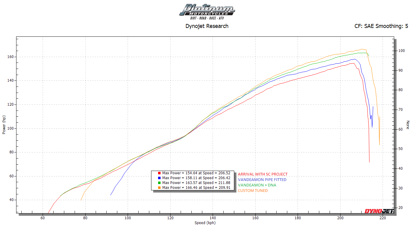 Even without tuning, riders can expect substantial horsepower gains straight out of the box. With tuning and a raised speed limiter, performance can be pushed even further, unlocking up to an additional 30 horsepower. As shown in the dyno graphs, the first image highlights a typical before-and-after gain, while the second demonstrates progressive tuning improvements on a different motorcycle, clearly showcasing the superior performance achieved when switching from a competitor’s muffler to the full VANDEMON exhaust system.